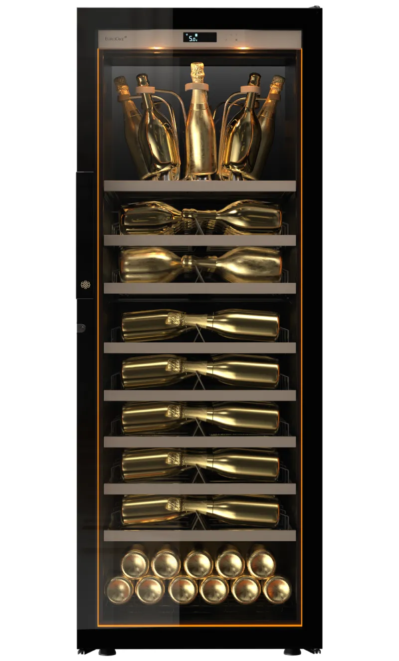 シャンパンクーラーの原理を応用した独自構造により、シャンパンを理想的な温度で管理し、その美しさを際立たせます。棚はターンテーブル仕様で、クロムメッキ仕上げのボトルサポートが、通常ボトルなら最大8本(75cl)、マグナムボトルなら5本までを上品に支えます。一般的なシャンパンクーラーとは異なり、常にボトルの温度を一定に保つことで、抜栓の瞬間まで理想シャンパンクーラーとは異なり、常にボトルの温度を一定に保つことで、抜栓の瞬間まで理想的な状態をキープ。乾杯のひとときをより上質で豊かな時間へと導きます。